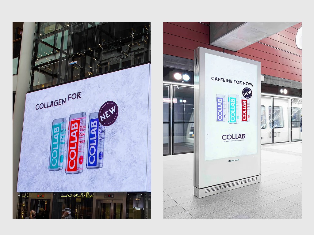 An outdoor campaign for the nationwide launch of Collab, featured on large screens in shopping malls across Denmark and throughout the Copenhagen metro system.